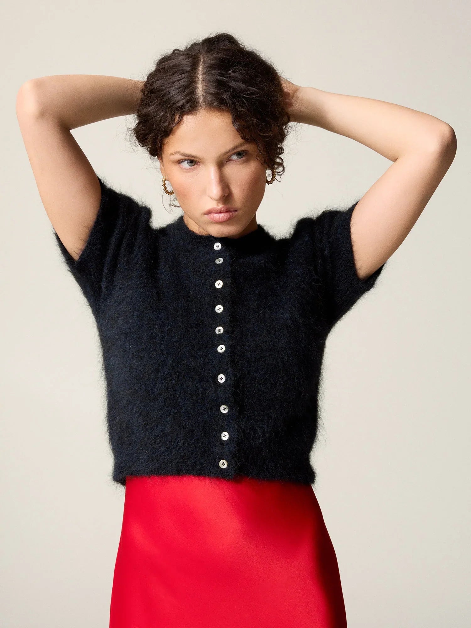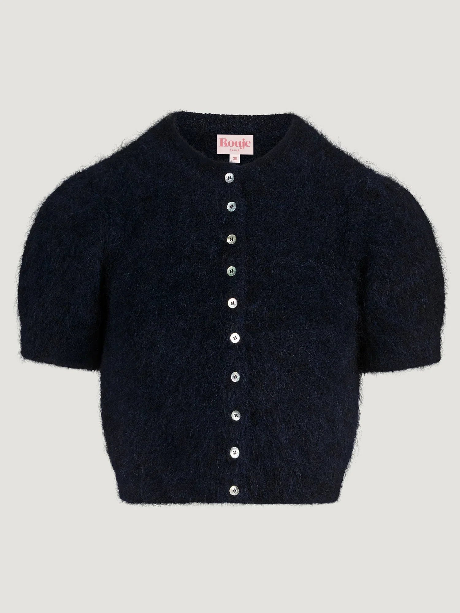 Short cardigan with short balloon sleeves.