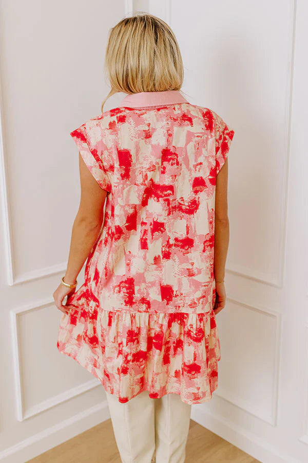- Add a pop of sunshine to your wardrobe with this cute mini dress! With a trendy print and classic cut, this piece is perfect for spreading good vibes wherever you go. - Lined, lightweight material with an abstract design featuring cream, scarlet, and a pink hue - A collared neckline - Short sleeve with rolled cuffs - A buttoned front - Pleated detailing on the front - Hidden side pockets - A relaxed silhouette that ends in a straight, mini dress length hemline