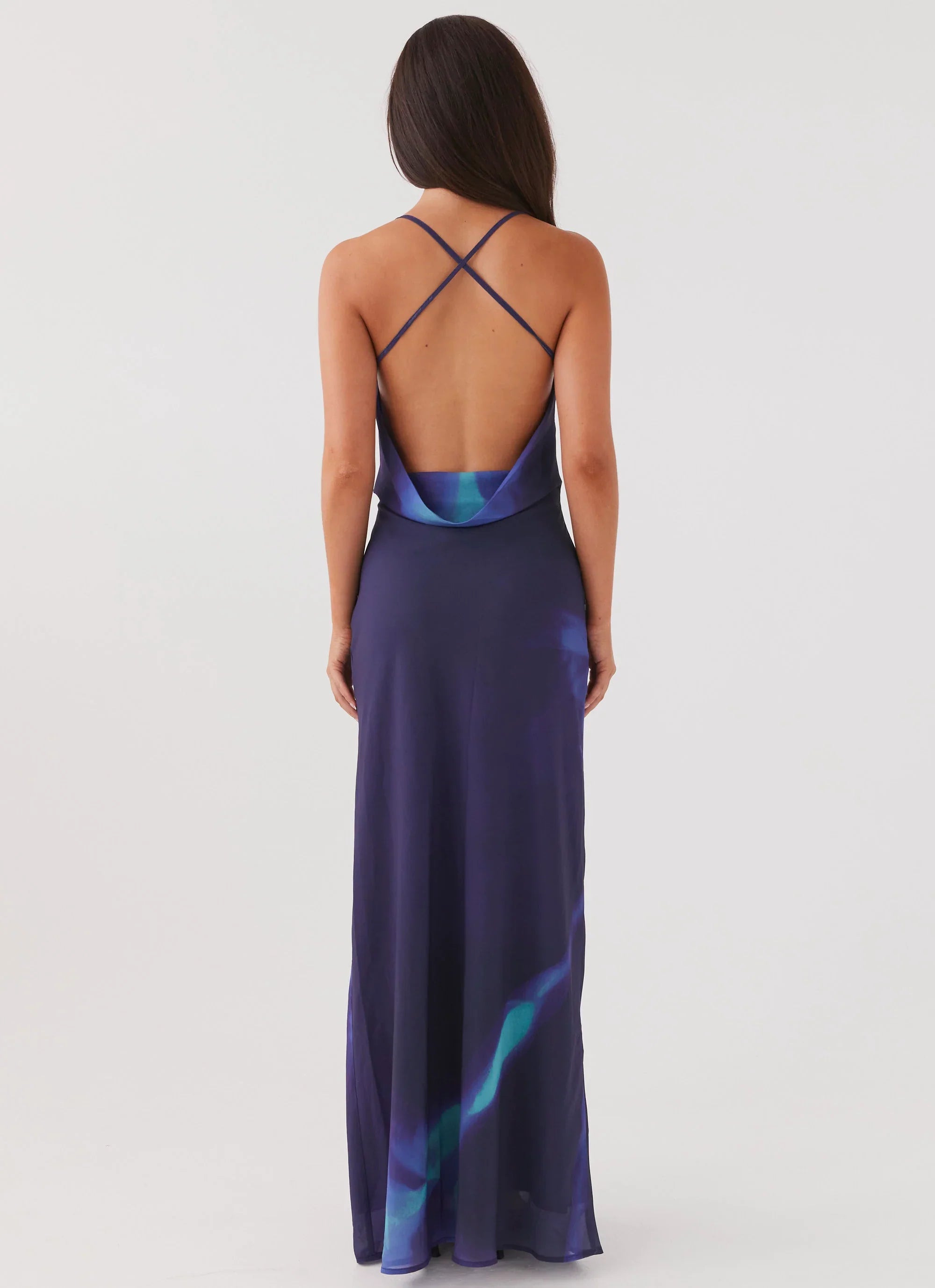 The Astra Maxi Dress: Designed for those who come alive in the PM. This stunning dress features a cowl neckline and semi-sheer design, along with our exclusive "Cyber Rose" print. Perfect for embracing balmy nights and captivating nightclub silhouettes.