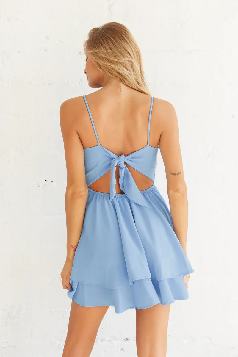 Ready for summer in the Ava Tie Back Ruffle Mini Dress! This flirty piece features a tiered ruffle design for a flouncy fit and an open back design with a flirty tie detail. Available in powder blue and white. Add a sparkly touch with the .