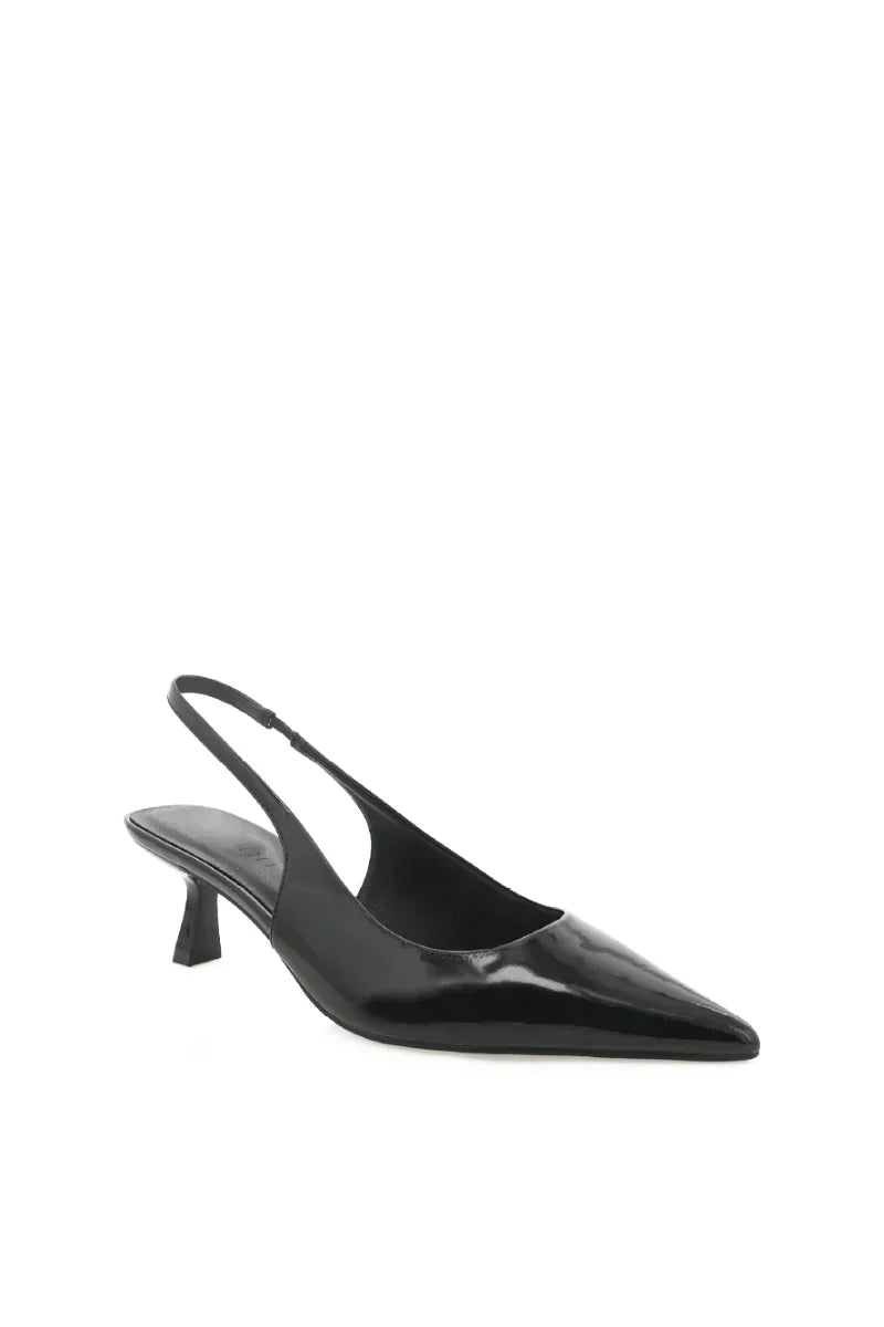 Ayla by Billini is a cross between a pointed pump and a kitten heel. This ultra-luxe style is the perfect day-to-night look! Featuring a low kicked in stiletto heel, simple court style upper, sling back strap with elasticated gusset, and an exposed heel counter. Available in black and bone patent. Pair with a chic for the perfect night out look!