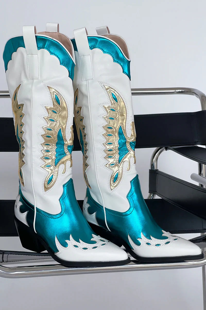 The cowgirl boots of your dreams just landed! The Azalea Wang Apolline Green Metallic Western Boot is a knee-high statement cowboy boot. Step out in style with this high-impact embroidered western boot. Featuring a white body with teal and gold metallic overlay details, and a black sole. Pair these boots with a cute for the perfect main character energy look!