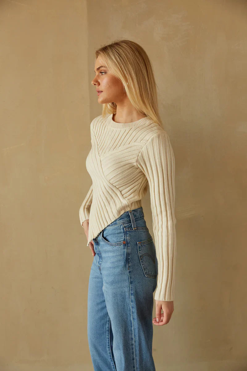 The Bailey Ribbed Knit Sweater is a cool-weather essential! This trendy top features a thick knit material, diagonal ribbed pattern, long sleeves, crew neckline, and a V-cut hem. Available in cream and brown. Pair with your favorite to complete this cute and casual look!