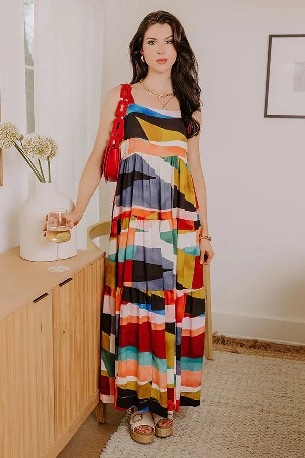 - Playful, stylish, and made for a girls trip, this color block cutie is ready for all your getaway moments! With a trendy print and a breezy fit, this maxi is perfect for twirling by the waves or strutting down the boardwalk. - Soft material with a color block design featuring black, cream, light pink, aurora red, and different shades of blue, yellow, orange, and green - A built-in partial lining ending above the knee - A square cut neckline - Elastic straps - A waistline with an elastic back - Hidden side pockets - A flowy silhouette that ends in a straight, maxi length hemline