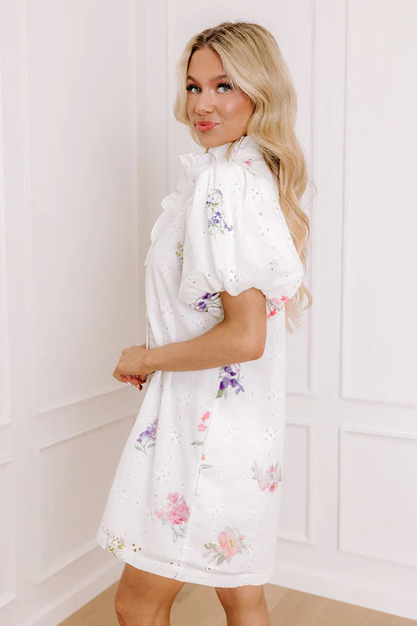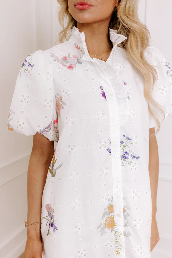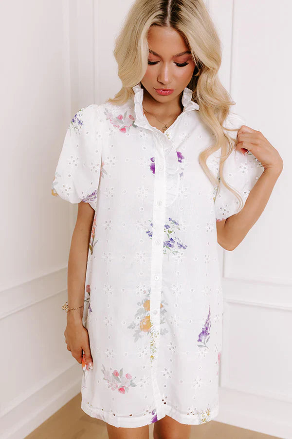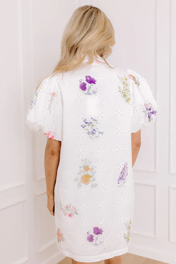 - Flaunt your bubbly sense of style in this eyelet mini dress! Designed with a dreamy floral pattern and playful ruffle details, this must-have piece is perfect for adding a touch of romance to your wardrobe. - Fully lined eyelet material with a floral print featuring different shades of orange, yellow, pink, green, and purple - A round neckline - Ruffle detailing around the neckline that continues onto the upper bodice - Short puff sleeves with elastic cuffs - A buttoned front - Hidden side pockets - A relaxed silhouette that ends in a straight hemline
