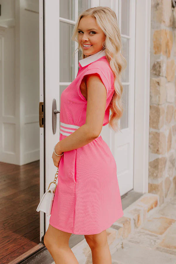 - Step into a look that's as sweet as candy in this darling mini dress! With its trendy striped accents and collared neckline it's the perfect combination of chic and playful. - Unlined stretchy ribbed material - Pink and white striped accents on the collar and waistline - A collared neckline - Front zip closure - Short sleeves - A wide elastic banded waistline - Hidden side pockets - A flattering silhouette that ends in a straight, mini dress length hemline