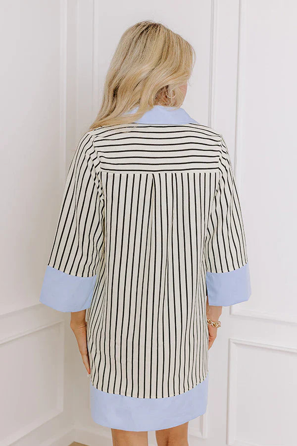 - Catch up at the country club in this stylish mini dress! Featuring a striped pattern and collared neckline, it brings just the perfect amount of preppy flair. - Unlined material; with a cream and black stripe pattern - Sky blue accent material - A collared v-cut neckline - Long sleeves with cuff slit accents - A relaxed silhouette that ends in a straight, mini dress length hemline with side slit accents