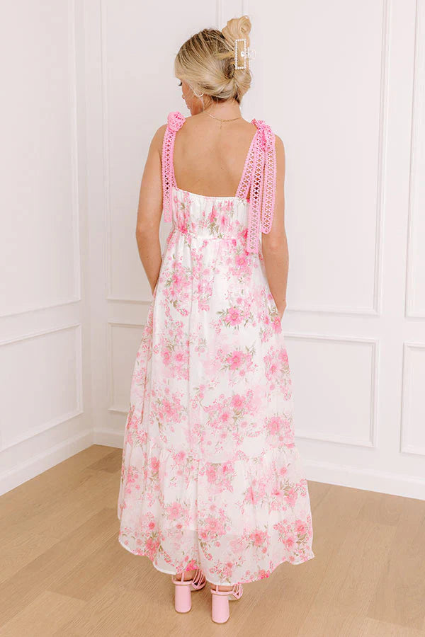 - Drift through floral fields in this dreamy maxi dress! Designed with shimmering chiffon and delicate crochet lace accents, this flowy look is perfect for brunch, photo sessions, and special moments. - Fully lined floral chiffon material with a subtle twinkling shimmer throughout - Features white and different pink and green hues - Pink crochet lace accents - A square cut neckline - Crochet lace straps that tie into bows at the top of the shoulders - A stretchy waistline with an elastic back - A flowy and flattering silhouette that ends in a maxi length hemline