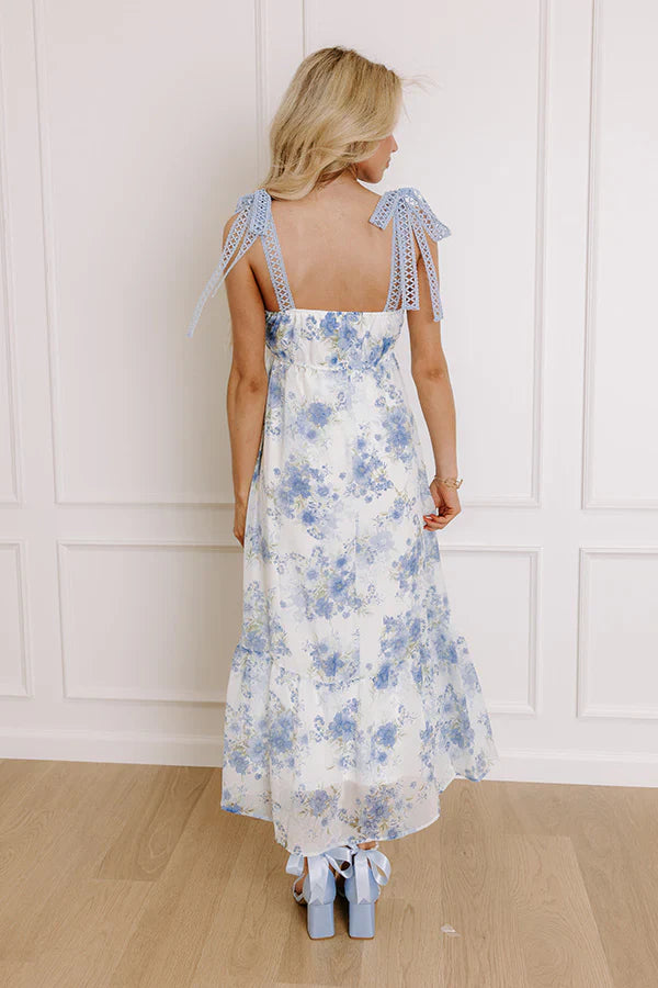- Drift through floral fields in this dreamy maxi dress! Designed with shimmering chiffon and delicate crochet lace accents, this flowy look is perfect for brunch, photo sessions, and special moments. - Fully lined floral chiffon material with a subtle twinkling shimmer throughout - Features white and different blue and green hues - Blue crochet lace accents - A square cut neckline - Crochet lace straps that tie into bows at the top of the shoulders - A stretchy waistline with an elastic back - A flowy and flattering silhouette that ends in a maxi length hemline