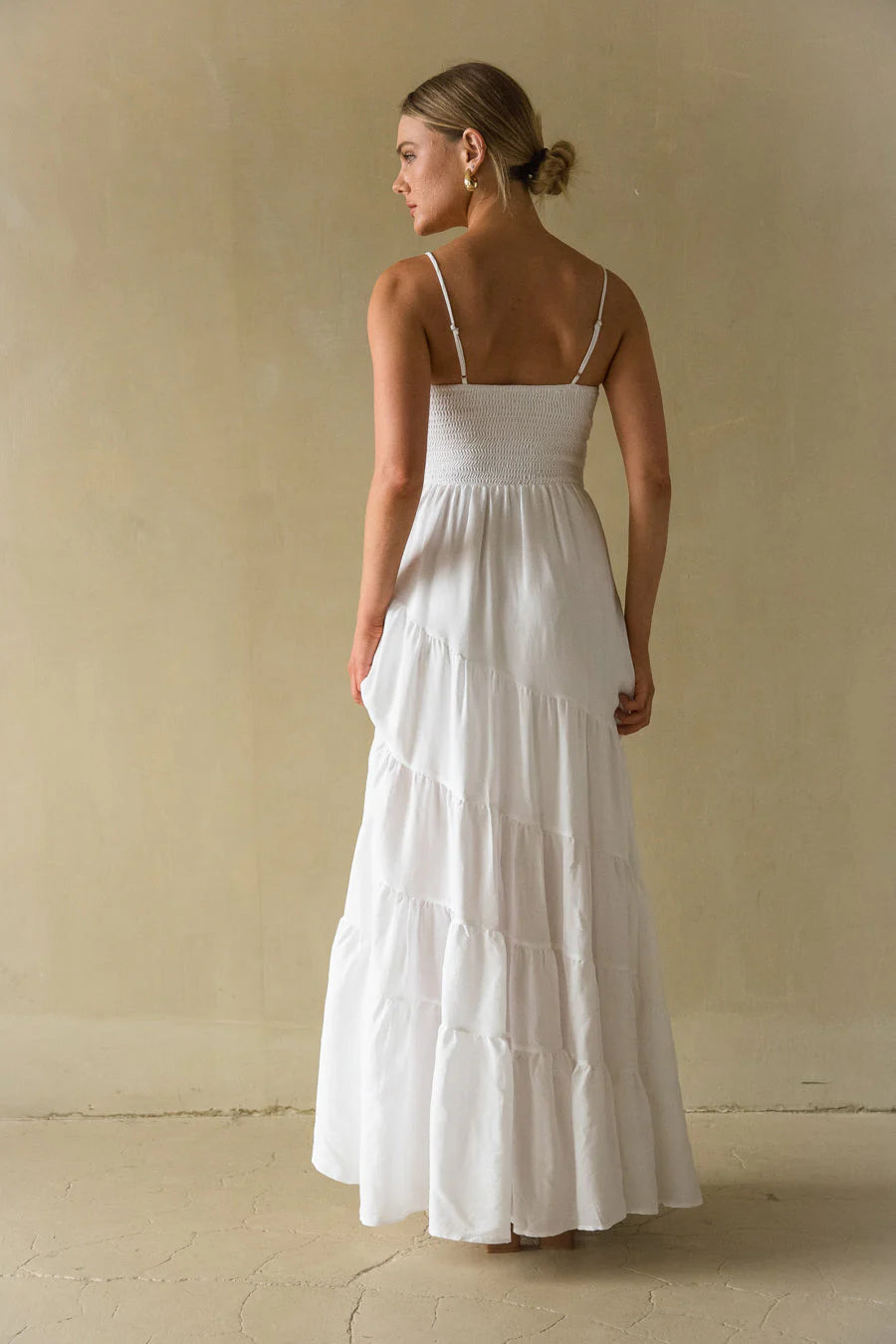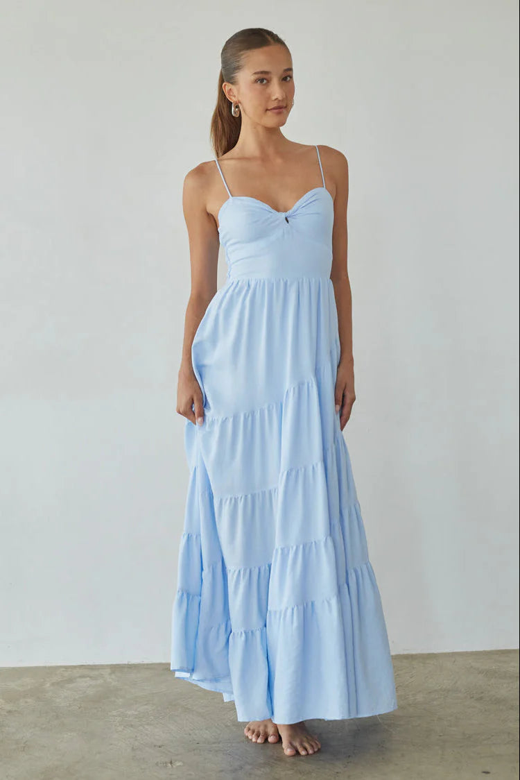 Calling all angels, the Donna Twist Front Tiered Maxi Dress is romance embodied. This white maxi dress features a flattering fit and flare silhouette, sexy twist front detail, and tiered flowy maxi skirt. to complete the look!