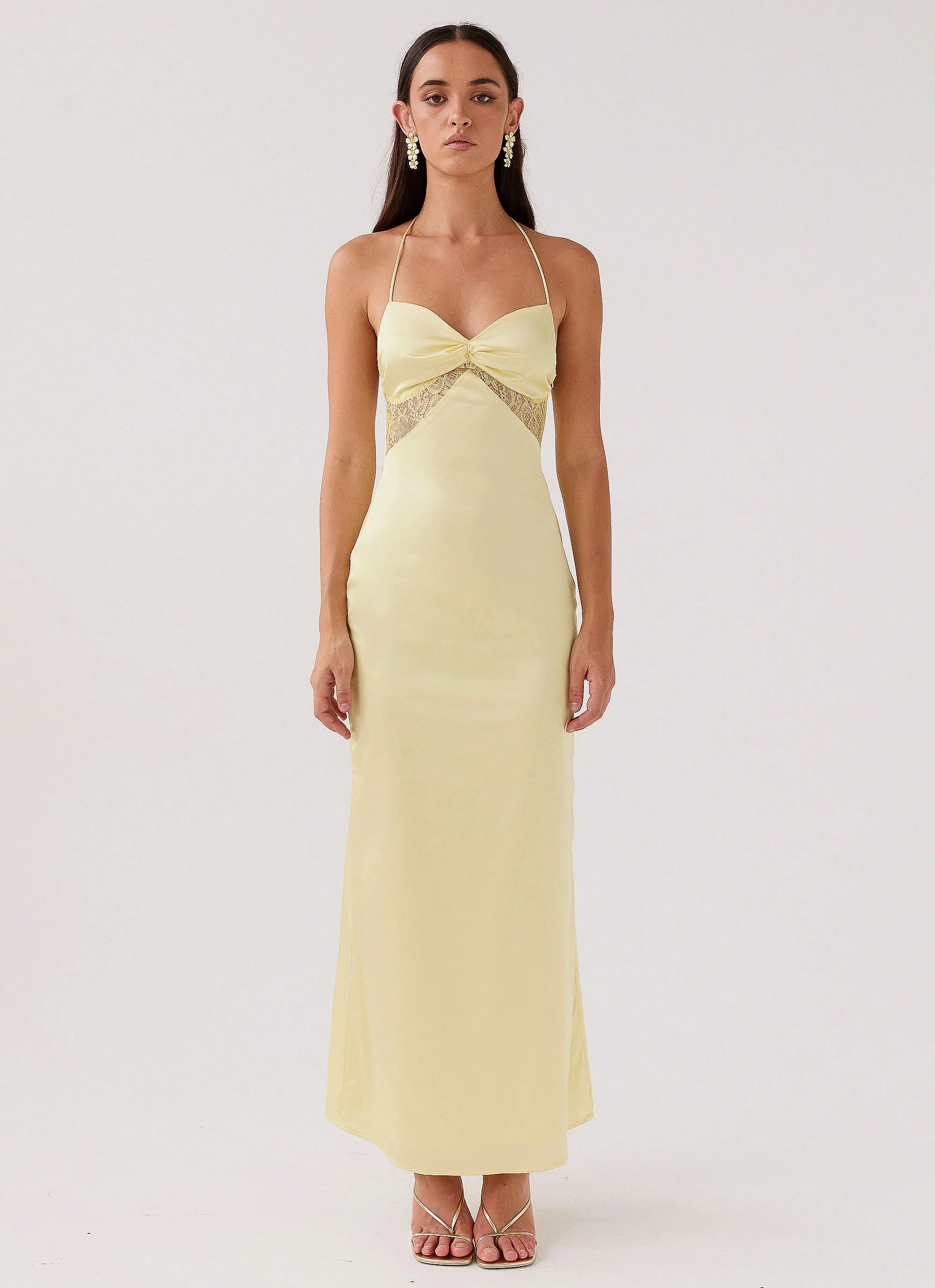 The Dream Sight Lace Satin Maxi Dress, where we celebrate the magic of PM. Crafted with delicate sheer lace detail and an alluring open back, this dress embodies the essence of golden skies and balmy nights.