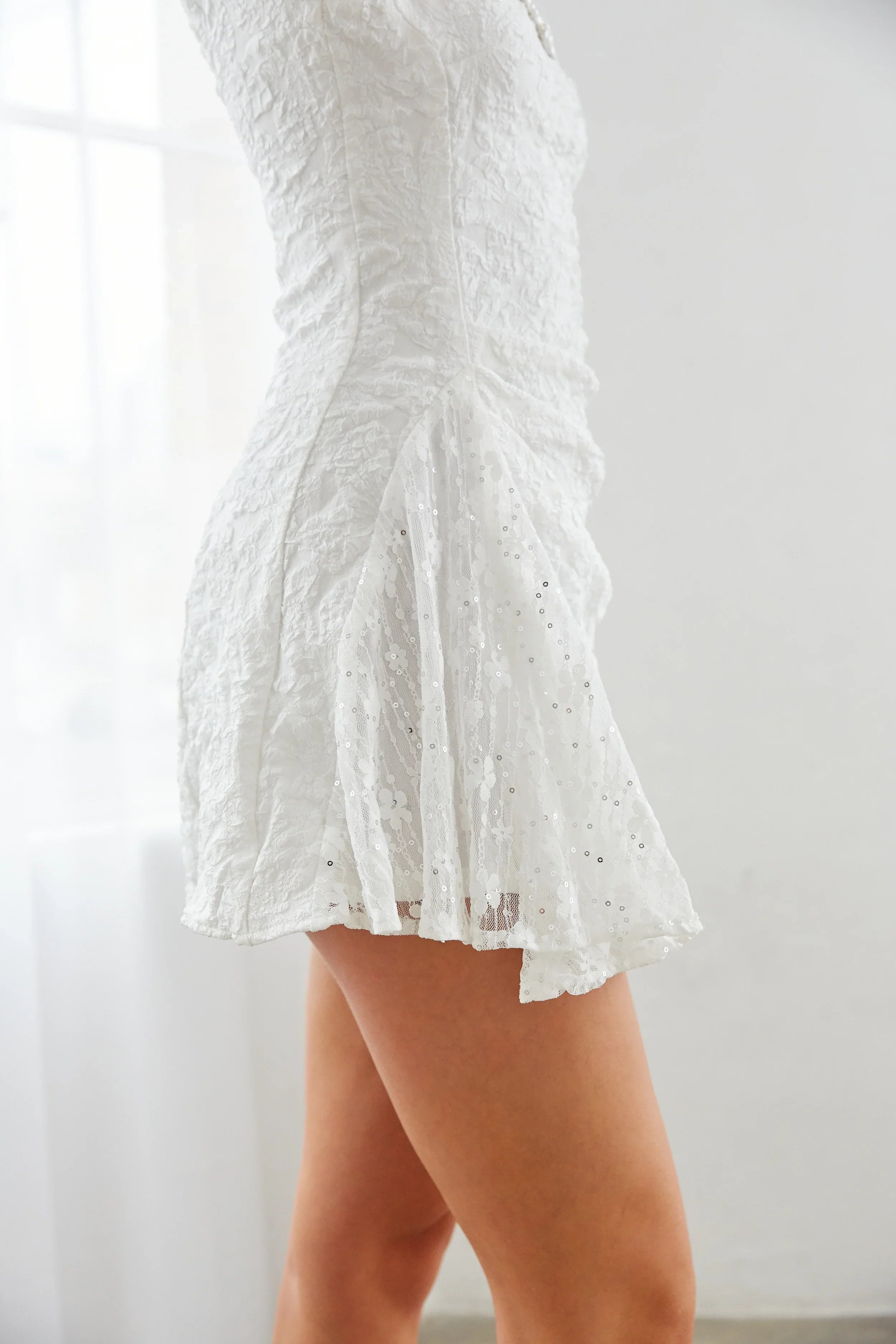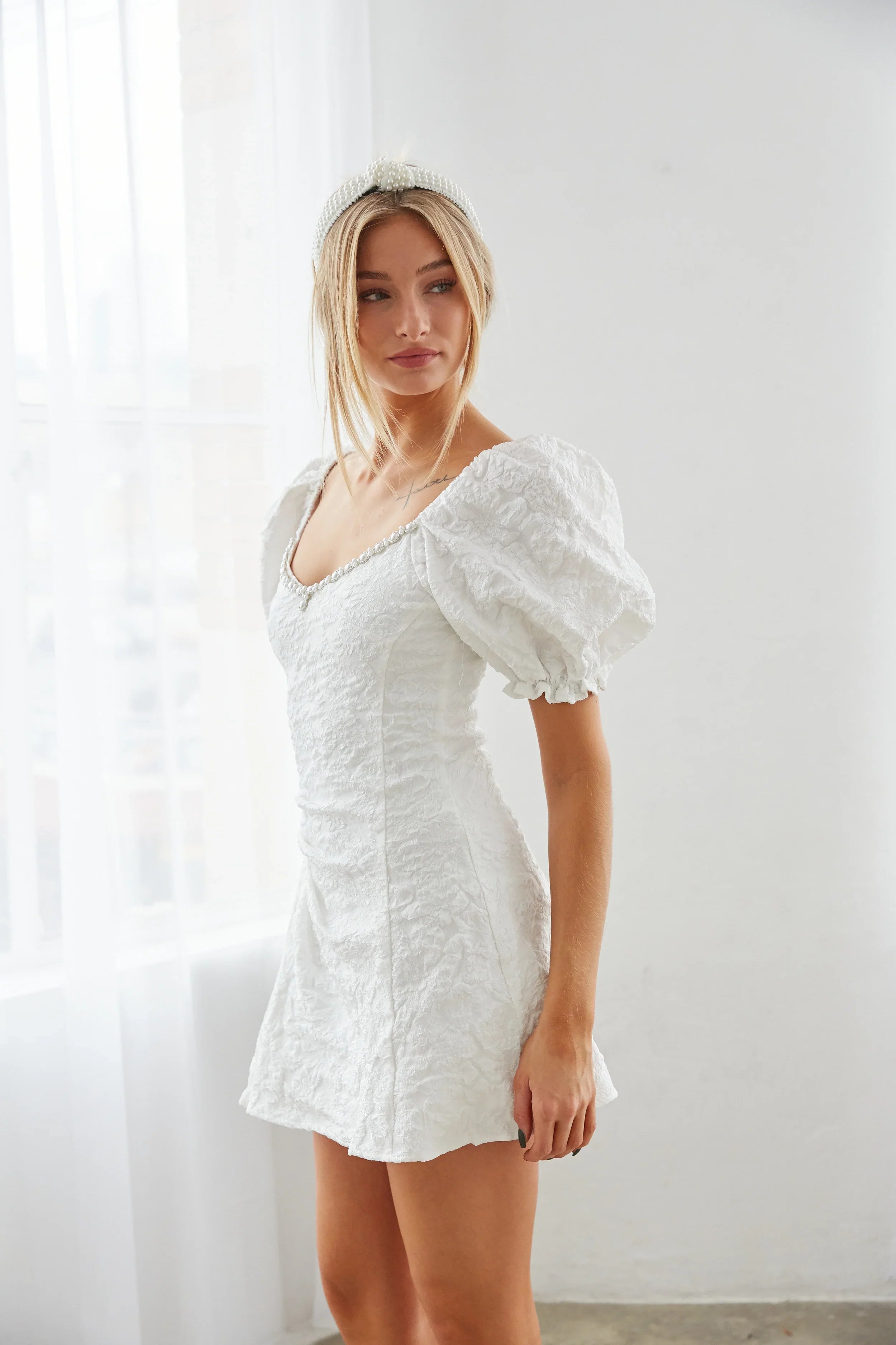 Achieve an elegant look with the Emerson Puff Sleeve Mini Dress. Featuring side ruching with sequin detail and a sweetheart neckline with pearl and rhinestone details. Add some cute to complete this look!