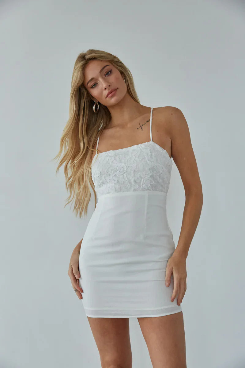 Celebrate warm summer days in the Emily Textured Floral Tie Back Bodycon Mini Dress! This sweet dress features a textured floral bust, straight across neckline, and an open back with a criss-cross spaghetti strap tie detail. Pair with a simple to complete the look!