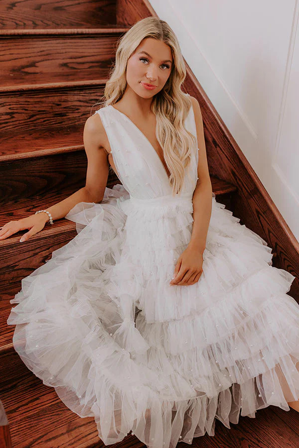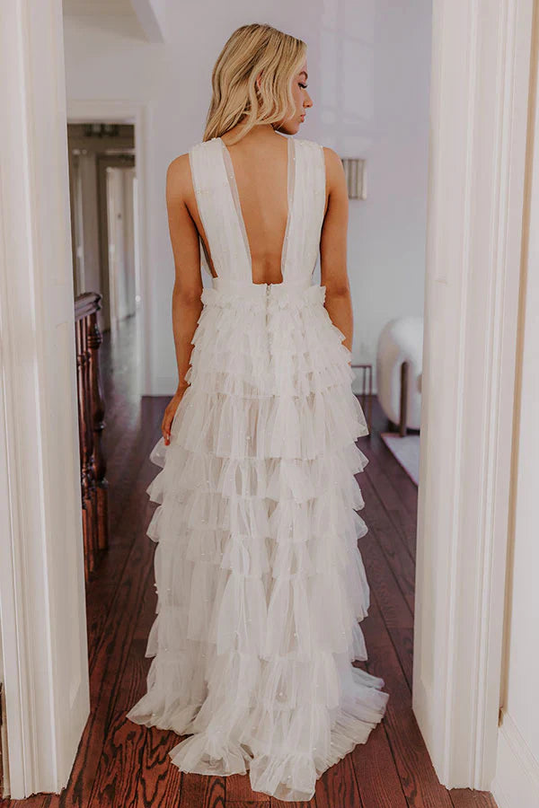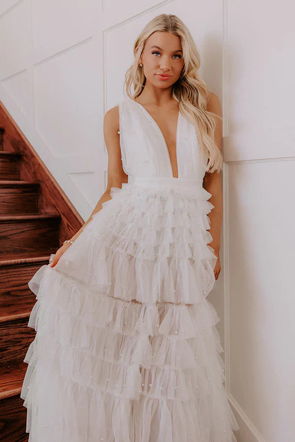 - Be ready to mesmerize with this stunning maxi dress! Gorgeous flowy tiers and pearl embellishment give this piece a whimsical vibe, perfect for embracing a romantic moment. - Sheer mesh material with faux pearl embellishment - A built-in lining ending in cheeky hemlines with a snap closure gusset - A deep-v neckline and back - Wide straps - An open back with low zip closure - Tiered ruffles on the skirt - A flowy and flattering silhouette that ends in a ruffled maxi dress length hemline