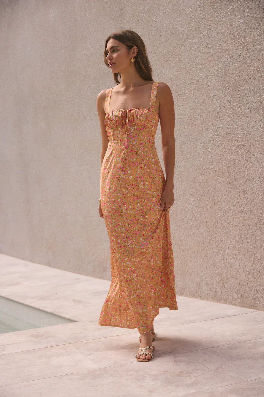 Brighten up any summer occasion with the FORTUNATE ONE Florence Maxi Dress in Orange. Exclusively Designed by Fortunate One, this stunning dress features a bold, vibrant color and a graceful silhouette, making it perfect for adding a splash of elegance to your sunny adventures.