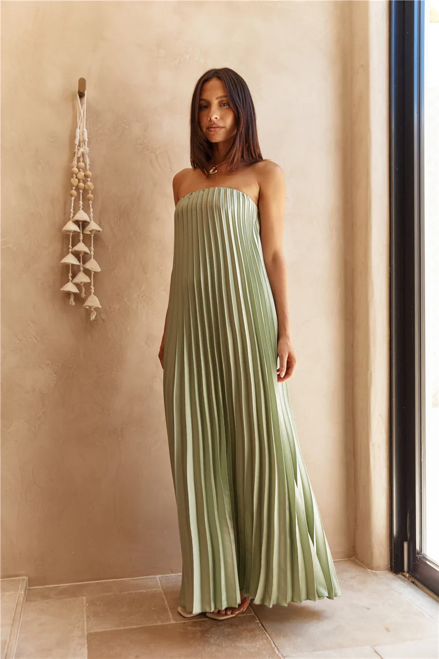 Float through the day in the Willow Breeze Pleated Maxi Dress in Sagegreen, a dreamy vision of movement and elegance. Crafted with a strapless silhouette, this dress flows effortlessly with finely pressed pleats that catch the light with every step. The soft sage hue adds a serene, nature-inspired touch, making it perfect for sunlit brunches, garden soirées, or barefoot walks on the beach.