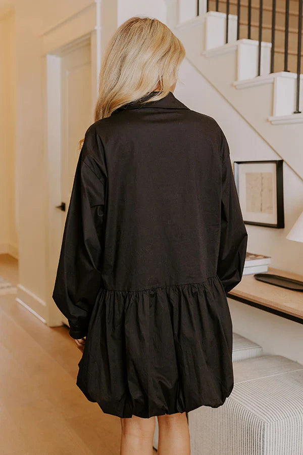 - From brunch with your bestie to happy hour meetups, this adorable dress has you covered! With its collared neckline and flirty mini dress cut, this cutie is all about combining playful energy with chic style. - Lightweight material - A built in skirt lining - A collared neckline - A button down bodice ending at the waistline - Long sleeves within, buttoned cuffs - A relaxed silhouette that ends in a mini dress length bubble hem