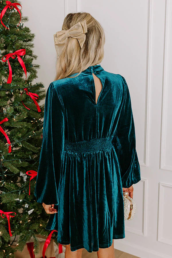 - Step into style with a velvet mini dress that's all about the details! Featuring a sleek mock neckline and subtle keyhole accents, this look balances elegance and allure, perfect for evenings out or special events. - Unlined velvet material - A mock neckline with back button closure and keyhole details on the front and back - Long sleeves with elastic cuffs - A waistline with pleated detailing on the front and a smocked back - A flattering silhouette that ends in a straight, mini dress length hemline