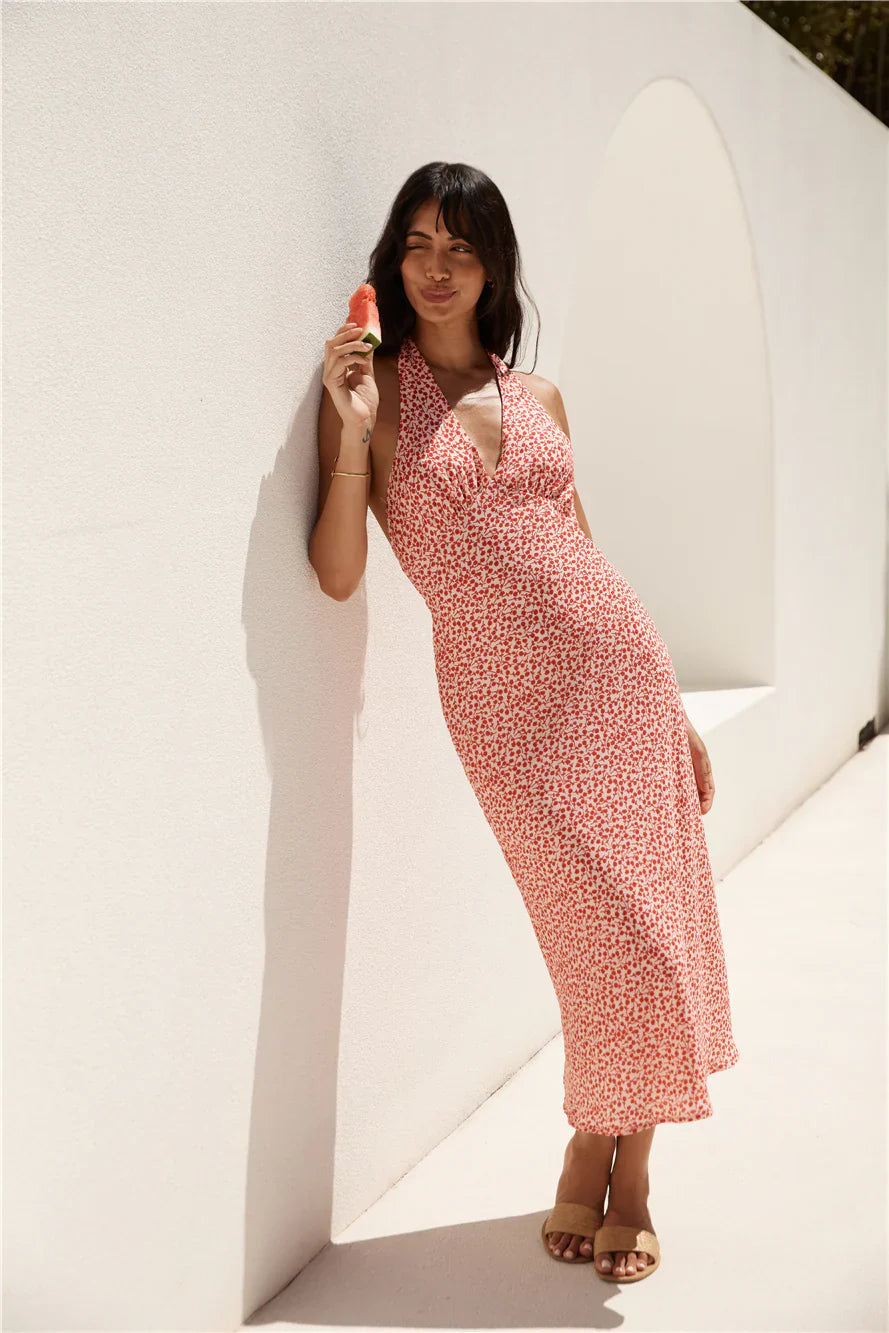 Unleash your inner beach goddess with the Island Dream Halter Maxi Dress in Red. This flowing, vibrant piece is a vacation essential that will have you turning heads as you dance the night away under the tropical stars.