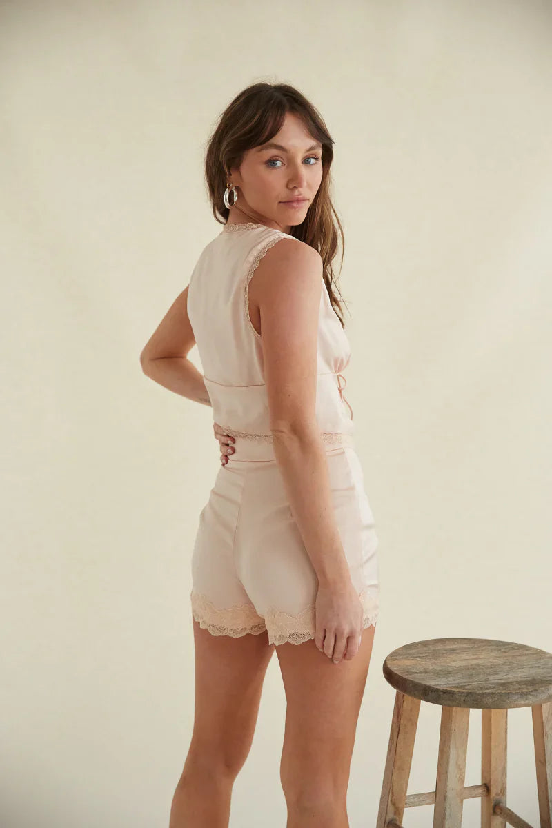 The Keili Satin Vest and Shorts Set is to die for! This lace trimmed two-piece set comes with a vest-style open front top with two front tie details and matching high-rise shorts. Available in black and champagne. Pair with some dainty to complete this effortlessly chic look!