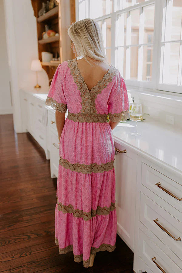 - Get swept away in a romantic moment in this sweet maxi! Featuring delicate lace and a flowy fit, it's the perfect choice for brunch dates, vineyard visits, and capturing effortless elegance. - Fully lined lace material with a subtle floral design - A v-cut neckline and a v-cut back with scalloped detailing - Short sleeves with scalloped cuffs - Side zip closure under one sleeve - Hidden side pockets - Brown hued lace accents - A flowy and flattering silhouette that ends in a scalloped maxi length hemline