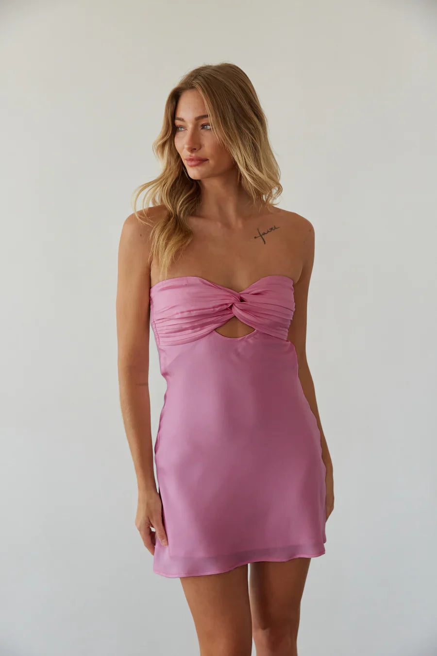 Dance the night away in the Kiara Strapless Keyhole Open Back Mini Dress! This stunning satin dress features a strapless sweetheart neckline with a center keyhole cutout, pleated twist front bust, and an open cowl back with two smocked elastic straps. Available in black, baby pink, sugar plum, cherry red, white, midnight blue, red, and cobalt blue.?Finish off the look with a chic?!