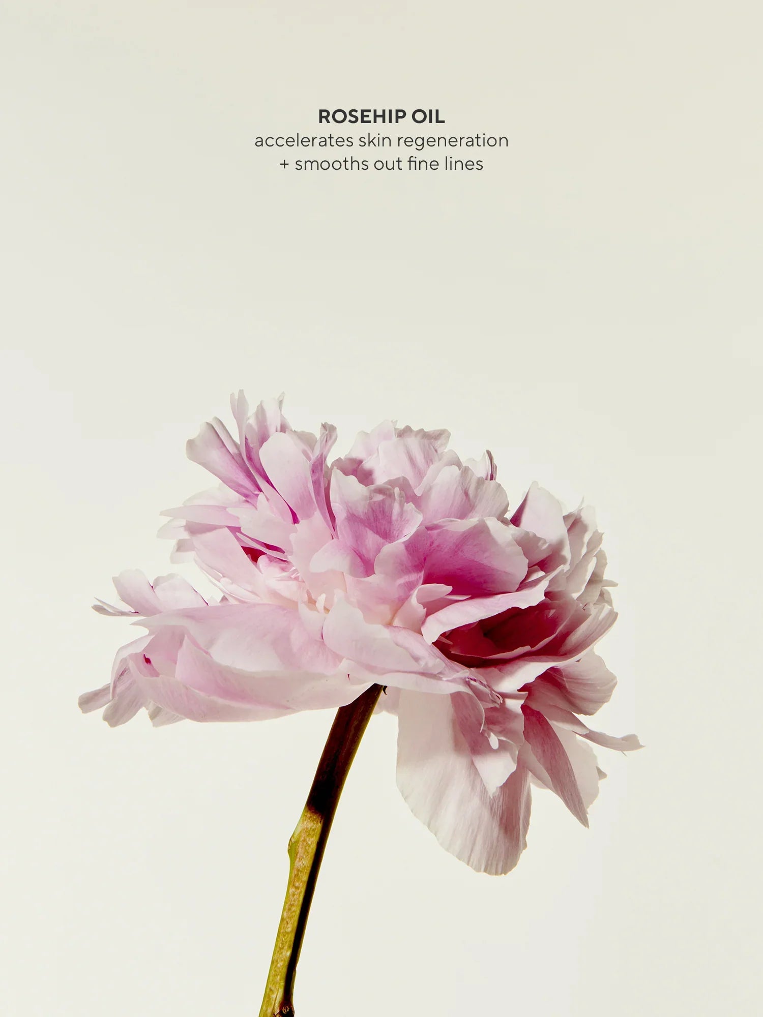Enriched with rosehip oil and peony extract, it is the perfect combo for an even complexion and regenerated skin. The formula contains hyaluronic acid that gives deep hydration and strengthens the skin barrier for plumped skin.