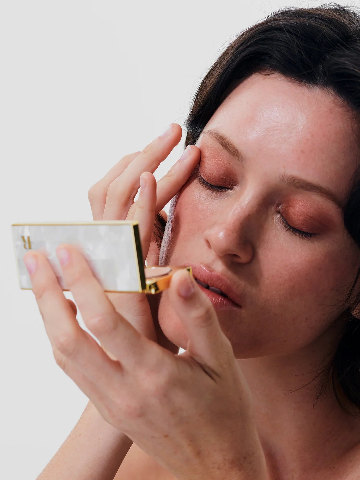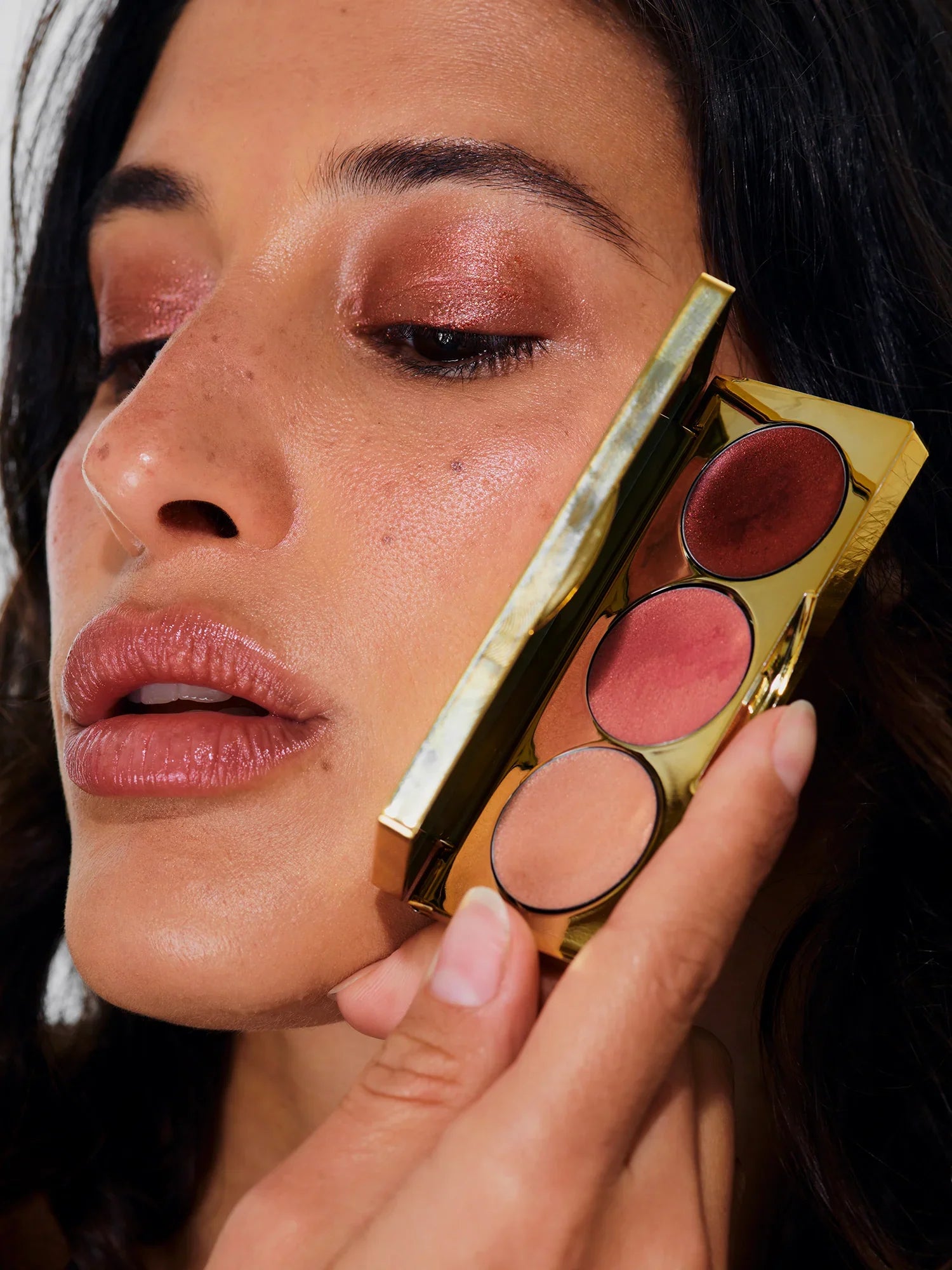Three shimmering shades with buildable intensity, Gold, Rose Gold and Gleaming Copper, promise a crease-free finish. Ensconced within a vintage-inspired natural mother-of-pearl checkerboard case, poised to grace your bathroom countertop.