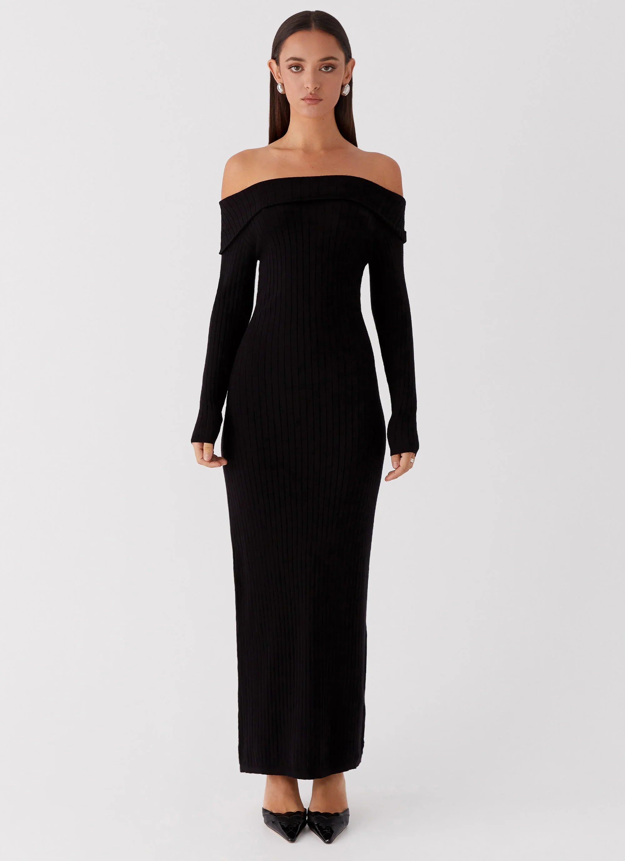 Experience the essence of evening elegance with our Lahey Knit Maxi Dress. With a chic fold-over neckline, off-the-shoulder design, and elegant long sleeves, it captures the allure of balmy nights