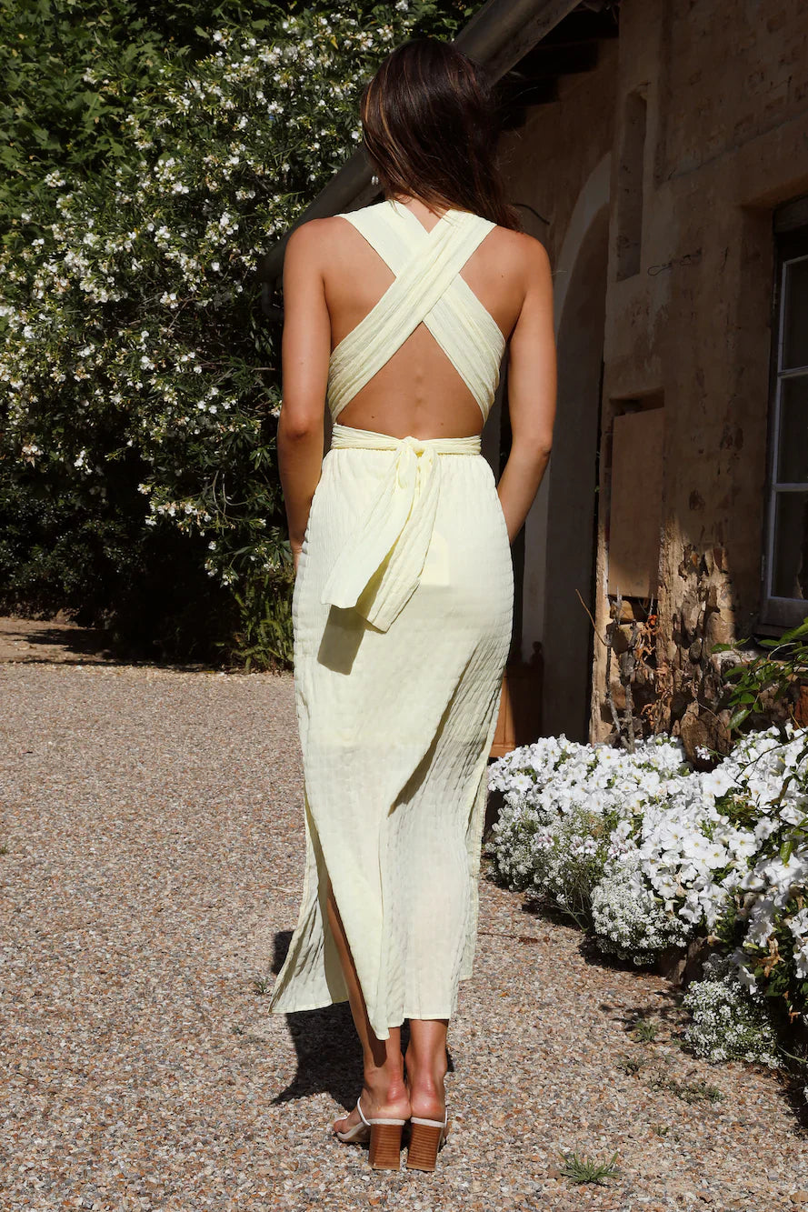 Enjoy late summer nights by the Italian Coast in the Late Night Maxi Dress in Yellow. A versatile dress that can match your mood and be worn in many different ways should definitely come with you on your adventures. Style with white heels and loose waves to complete the look.