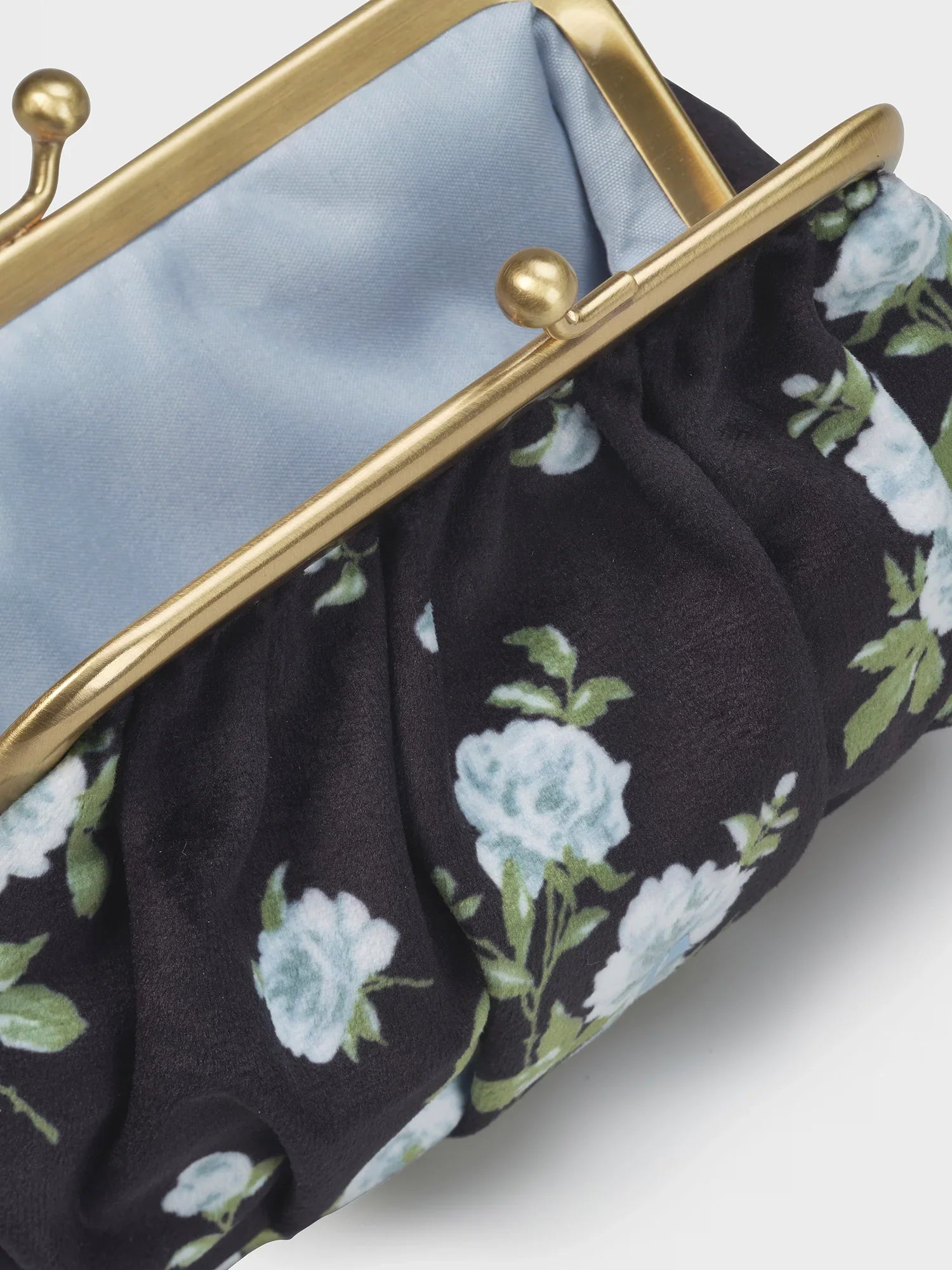 Black and baby blue floral motif makeup pouch with gold kiss clasp.