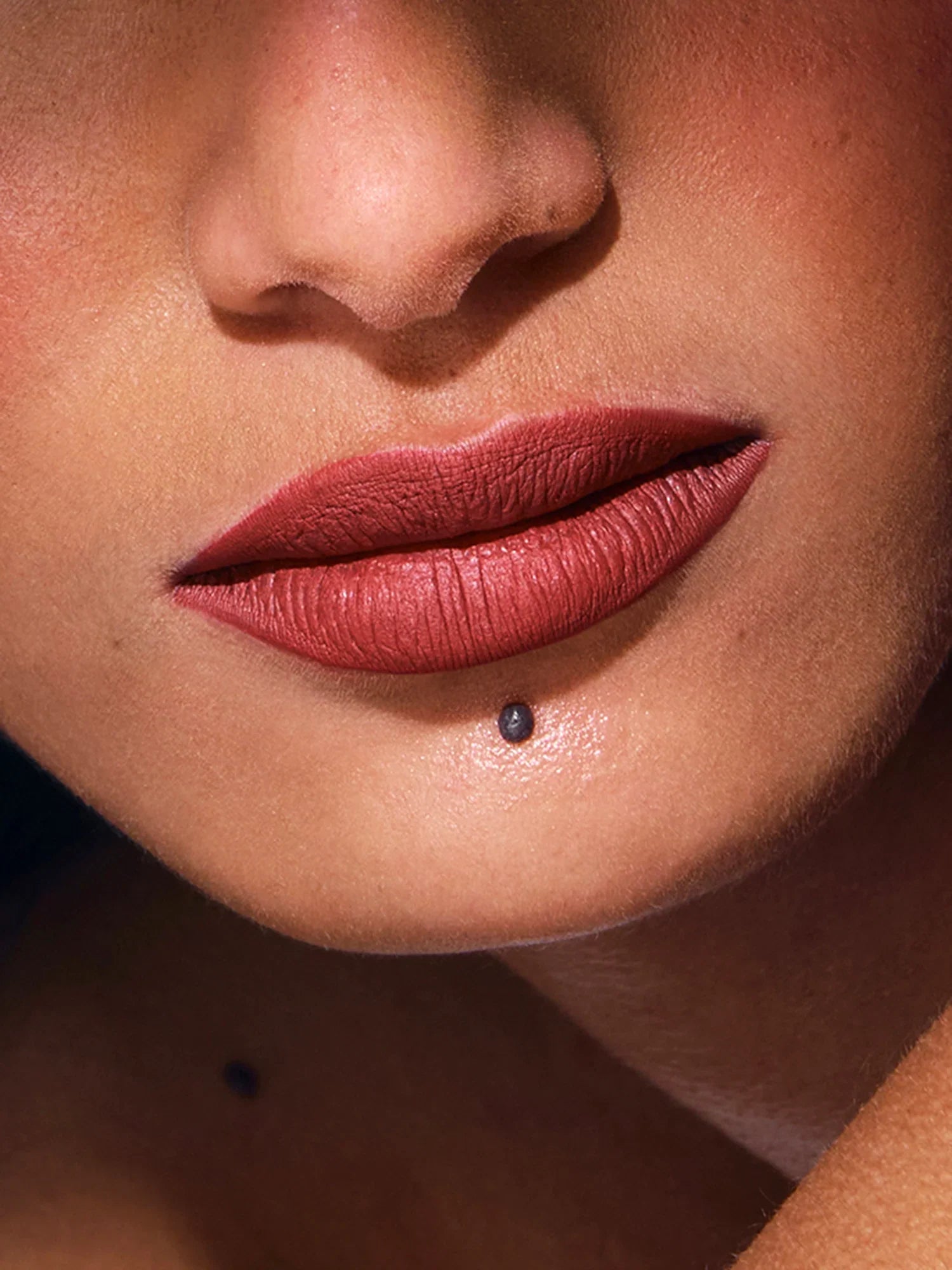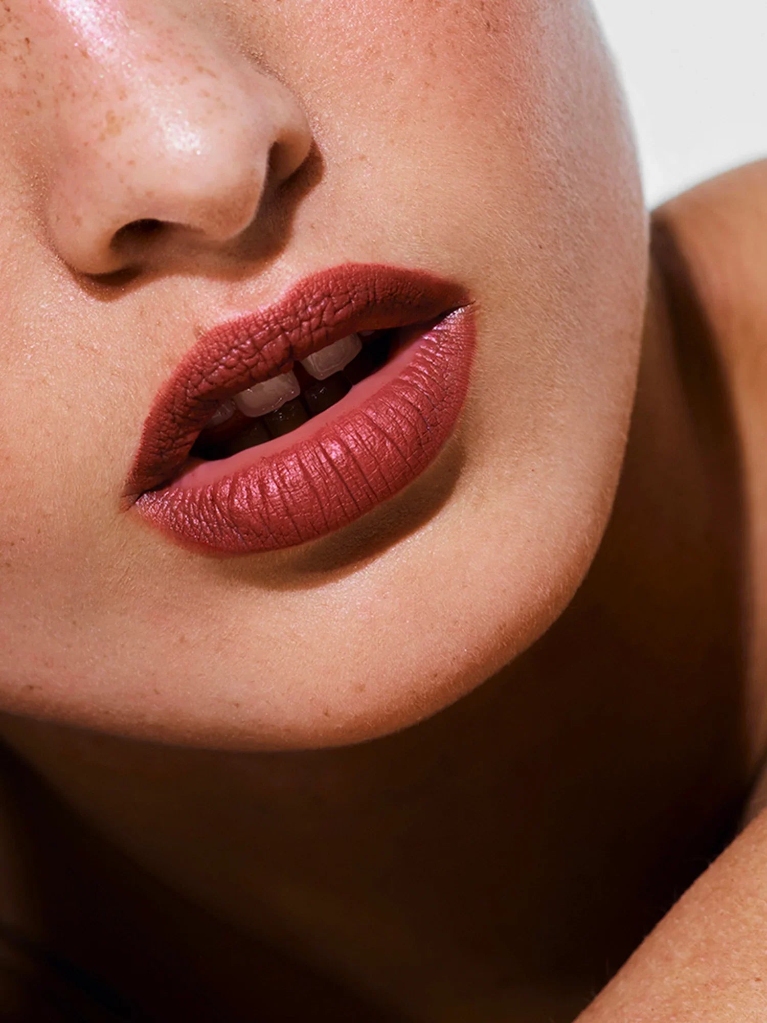Le Velours our creamy long-lasting liquid lipstick has a clean and natural formula for an easy and smooth application. Thanks to its 92% of natural origin ingredients, the formula is comfortable and very pigmented. Available in five must-have shades perfect for vibrant lips that last all day long. The Marie shade: an automnal russet red.
