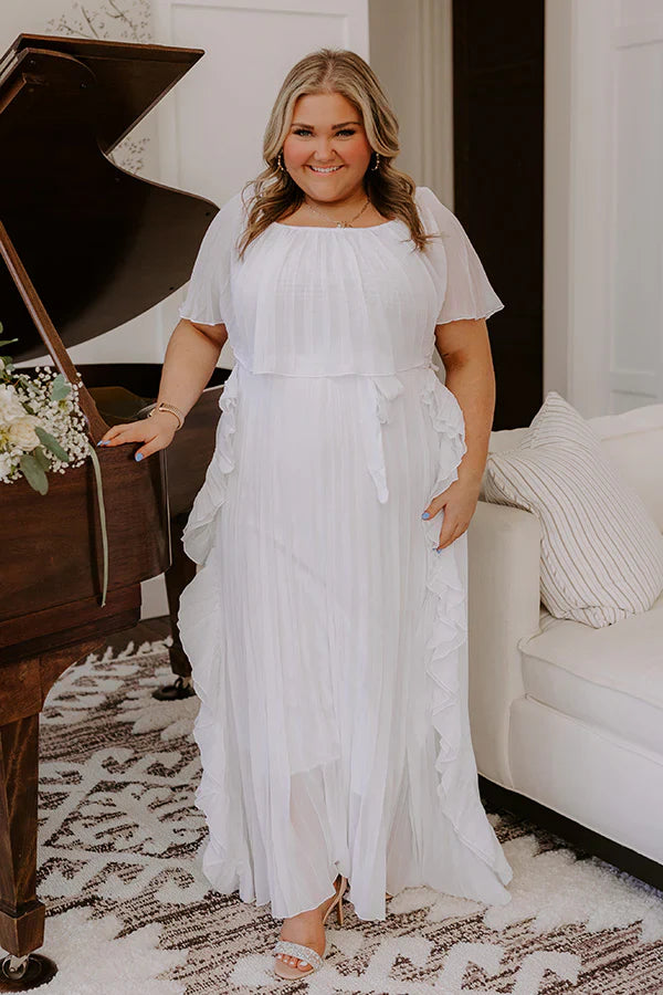 - Twirl into a mesmerizing moment in this stunning pleated maxi! With its flirty off-shoulder cut and whimsically flowy material, this dress was made to keep all eyes on you. - Pleated chiffon material - A built-in skirt lining - An elastic, wide neckline designed for an off-shoulder option - An overlaid, smocked bodice - A stretchy, elastic waistline with belt loops and a removable tie closure belt - Ruffle accents down the sides of the skirt - A flowy, yet flattering silhouette that ends in a pleated, maxi length hemline
