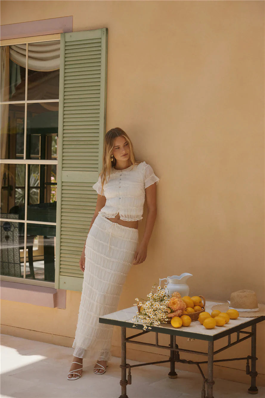 Feel elevated and adorable in The Luna and Lola Set. The stunning ruffle throughout the top and skirt adds that little extra to elevate your look. A stylish and adaptable look ideal for casual walks through delightful neighborhoods or browsing vibrant street markets with friends.