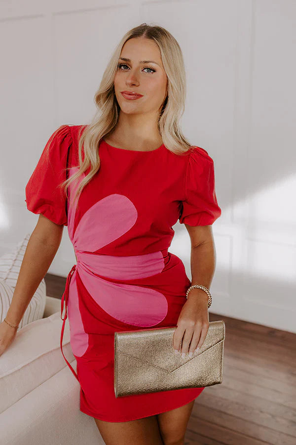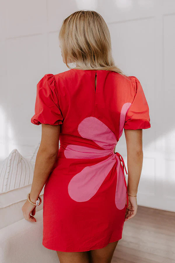 - Make a stylish statement with this trendy mini dress! With its adorable flower cutout, this piece promises to turn heads wherever you go. - Fully lined material with a flower pink hued flower design on one side - A cutout with a functional drawstring in the center of the floral design - A round neckline with a buttoned back and a keyhole detail - Short puff sleeves with elastic cuffs - Side zip closure under one sleeve - A flattering silhouette that ends in a straight mini dress length hemline