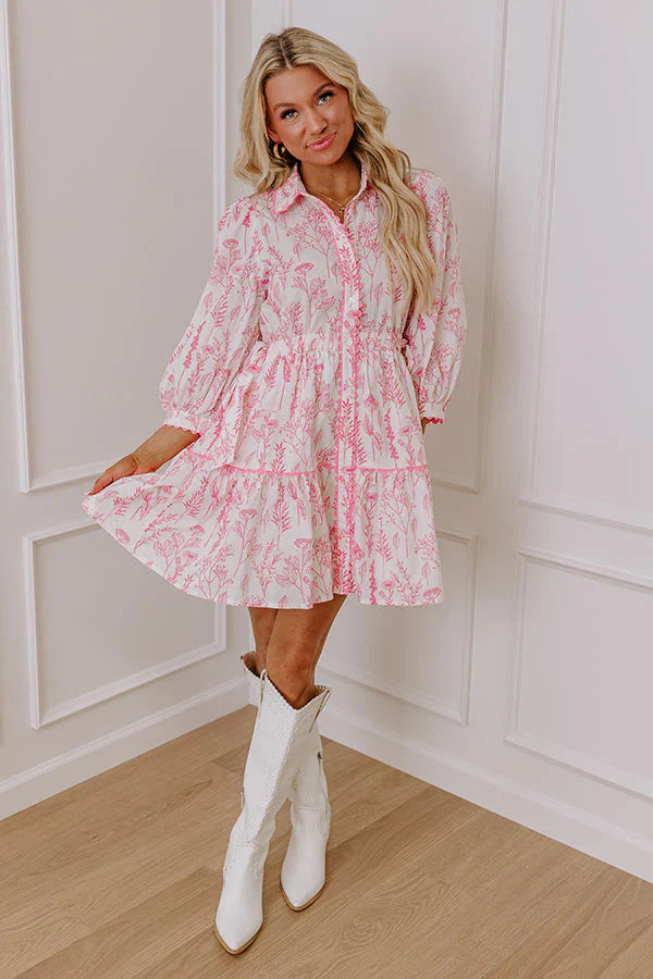 - Spring has sprung with this adorable mini dress! With a sweet wild flower print and trendy ricrac accents, this cutie is all about staying floral season fabulous. - Lightweight material with a pink hued floral print - Pink hued ricrac accents - A collared neckline - A buttoned front - Long sleeves with thin cuffs - A built-in skirt lining - Functional drawstrings at the waist line that tie at each side - A relaxed and flattering silhouette that ends in a mini dress length hemline