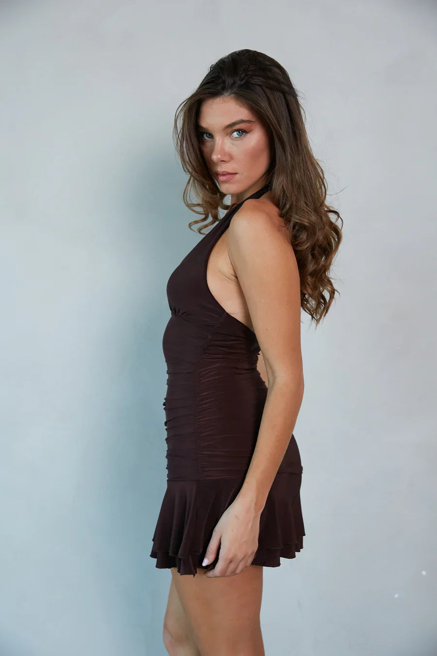 The Mia Halter Bodycon Mini Dress is the perfect for the Espresso lovers! This mini dress features a groovy halter neckline, ruched bodycon fit, and flirty ruffle skirt hem! Available in Espresso Brown; style with a chic pair of to complete the look!