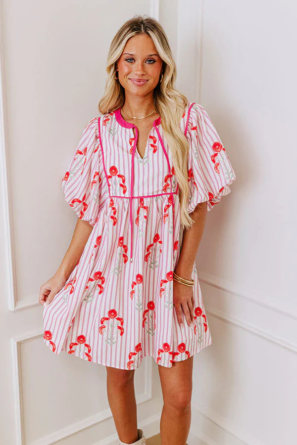 - Cue the charm! This stylish striped floral mini dress is all about casual cuteness, ready to make your everyday outfits feel a little extra special! - Fully lined light pink and white striped material with an abstract floral print featuring peach, red, and green hues - Hot pink trim - A v-cut neckline with a tie detail - Short puff sleeves with elastic cuffs - A relaxed babydoll silhouette that ends in a straight, mini dress length hemline