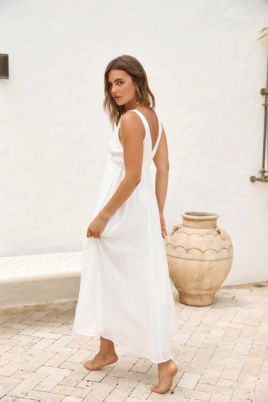 Wake up to sunny days in the Morning Sun Maxi Dress in White. Featuring a flowy design to make you feel free and dreamy, you'll need this dress and feeling for your summer getaway. Style with gold adornments.
