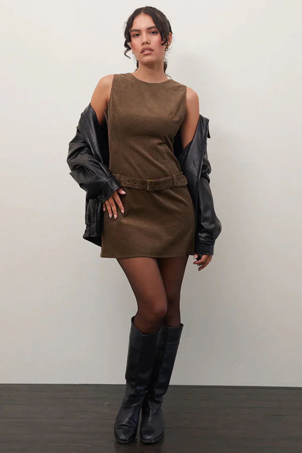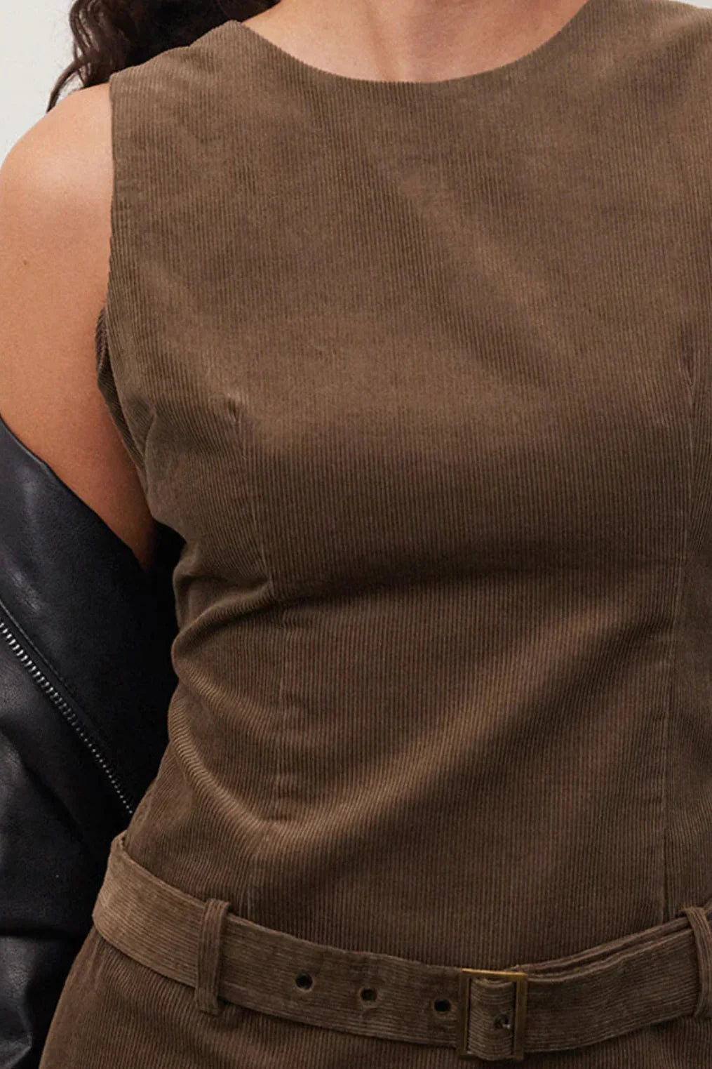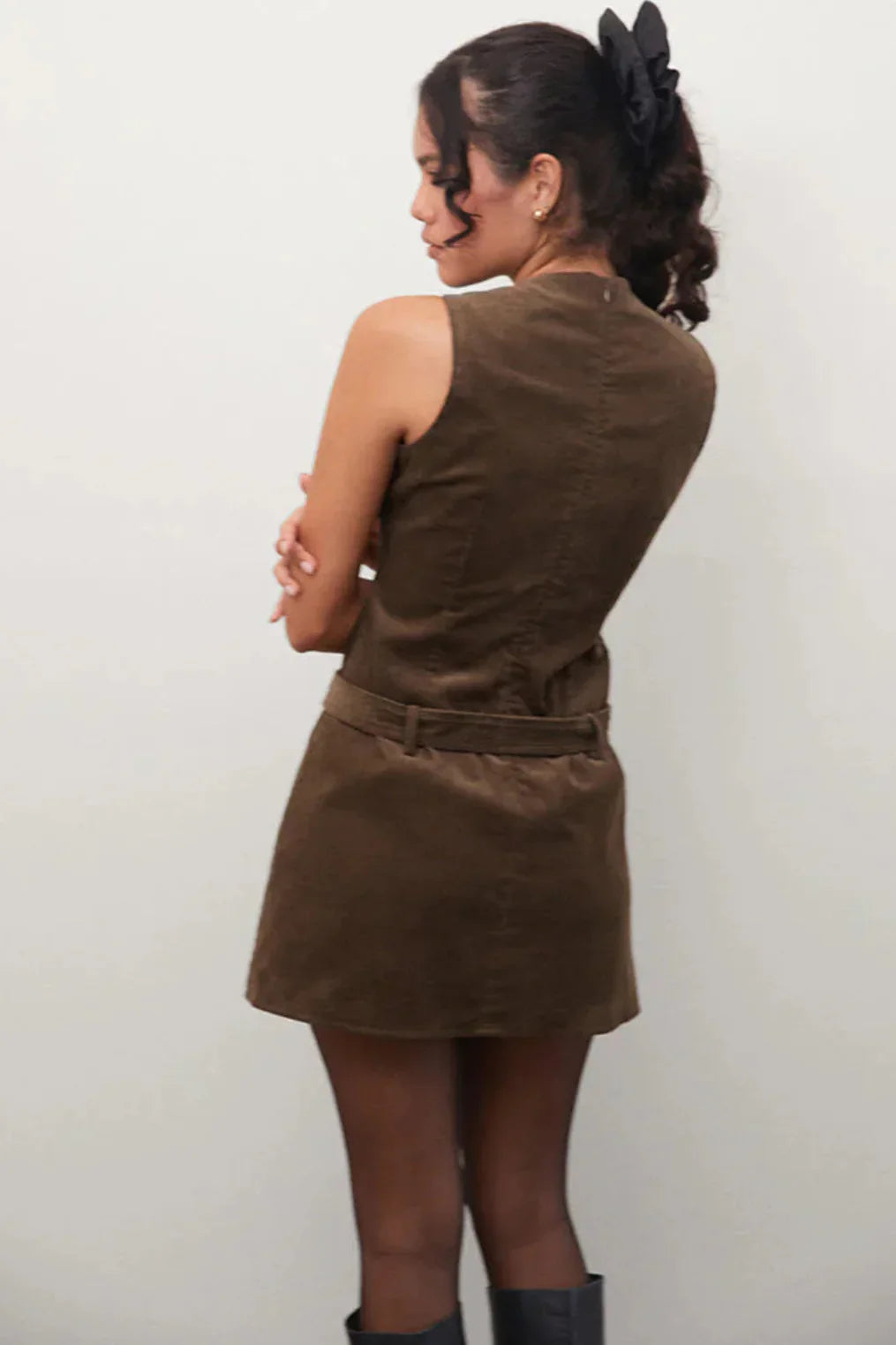 A-line brown cord mini dress.