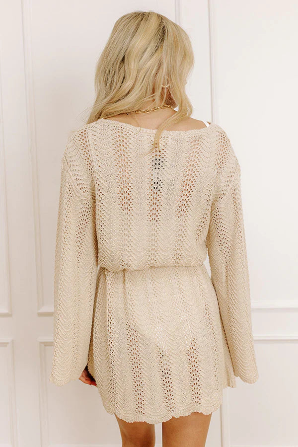- This cute mini dress cover-up is all about that boho vibe! With its pointelle knit design, it's the perfect piece for poolside style and tropical getaways. Versatile and stylish, it's a must-have for your next sunny escape! - Unlined pointelle knit material - A scalloped round neckline - Long sleeves with scalloped cuffs - A removable tie closure belt with accent tassels - A relaxed and flattering silhouette that ends in a scalloped, mini dress length hemline