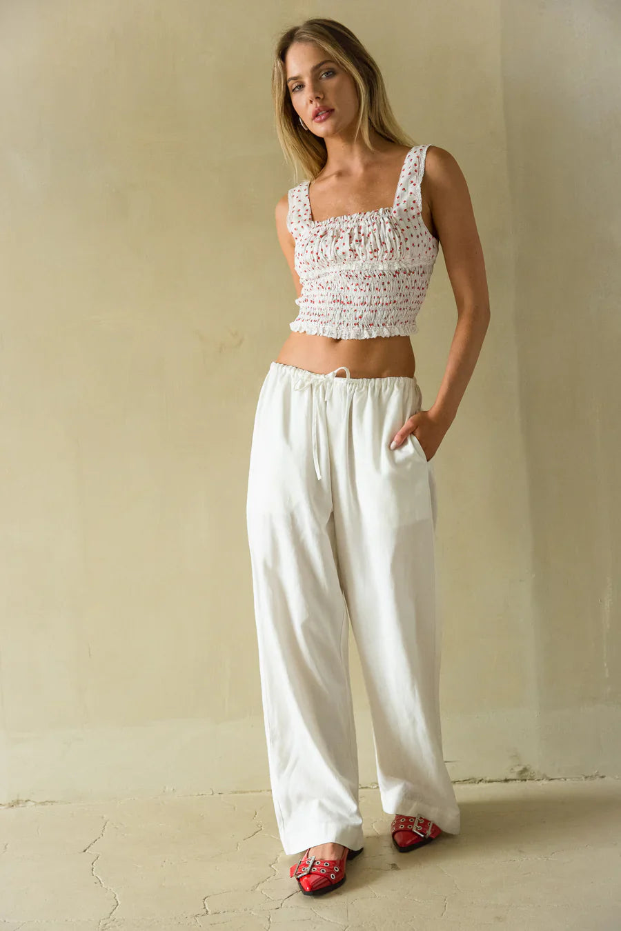 Oh so dainty, the Posie Picnic Smocked Top is a Summer need! This top features a red floral print, ruffle trim, and pleated bust! Pair with the to complete the look!