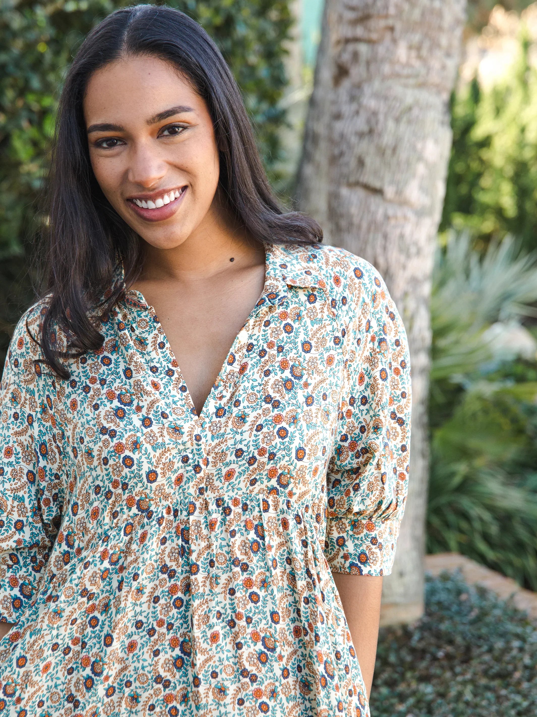 It’s no wonder that our Rebecca Midi Dress has been given over 2,000 FIVE STAR reviews! This all-time best seller is flattering for any shape and is super easy to wear. It’s fitted at the top with a buttoned bodice and a winsome empire waist. The high-low hem is ready to show off your favorite sandals, boots or heels. The rest of this tiered dress flows in a relaxed fit that keeps you comfortable in a beautiful, cream orange border print that gives it even more personality... and it has pockets! Wear it to brunch, shopping or even an outdoor wedding! Grab this dress in all of our boho colors and prints so you have one for every day... and any occasion!