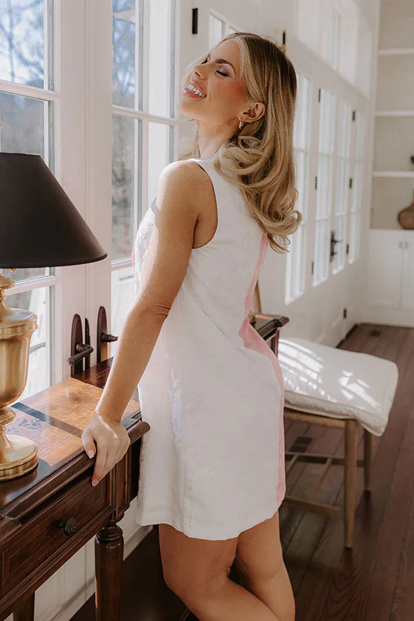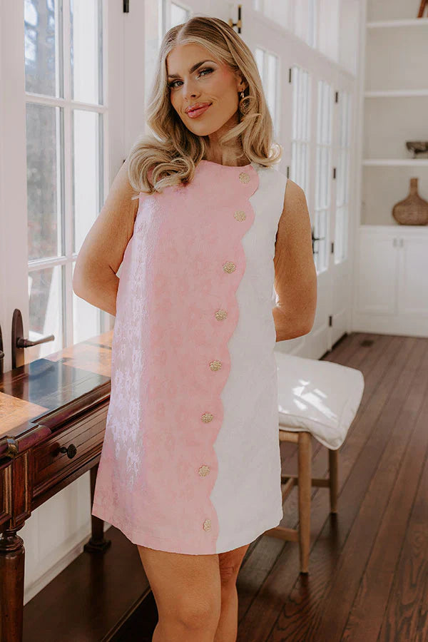 - Radiate charm and elegance with this jacquard mini dress! Featuring luxe floral fabric and a chic color block design, this stylish dress is perfect for making a statement at any occasion. - Fully lined floral jacquard material - A round neckline - Back zip closure - A faux buttoned front featuring gold colored button accents and scalloped detailing - A sleeveless cut - A relaxed silhouette that ends in a straight, mini dress length hemline