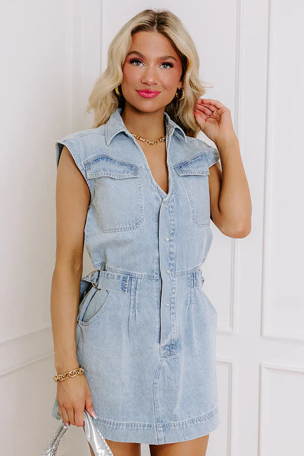 - Casual, chic, and ready to shine! This fabulous denim mini dress has all the trendy details to keep you looking like the main character. From its cinched waistline to its flirty v-cut neckline, this cutie is full of style. - Unlined denim material - A collared v-cut neckline - A sleeveless cut - Functional chest pockets - Pleated accents on the front of the skirt and upper back - A buttoned front ending below the waistline - A waist cinching detail on the back of the waistline and buckles at each side - Belt loops on the back of the waistline - Functional front and back pockets - A relaxed yet flattering silhouette that ends in a straight mini dress length hemline