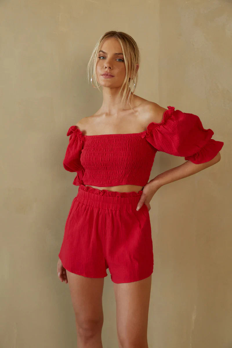 Spice up your outfit with the Ruby Smocked Puff Sleeve Crop Topp! This bright top features a square neckline, smocked bodice, and dramatic puff sleeves with a ruffle trim. Pair with the matching to complete the look!
