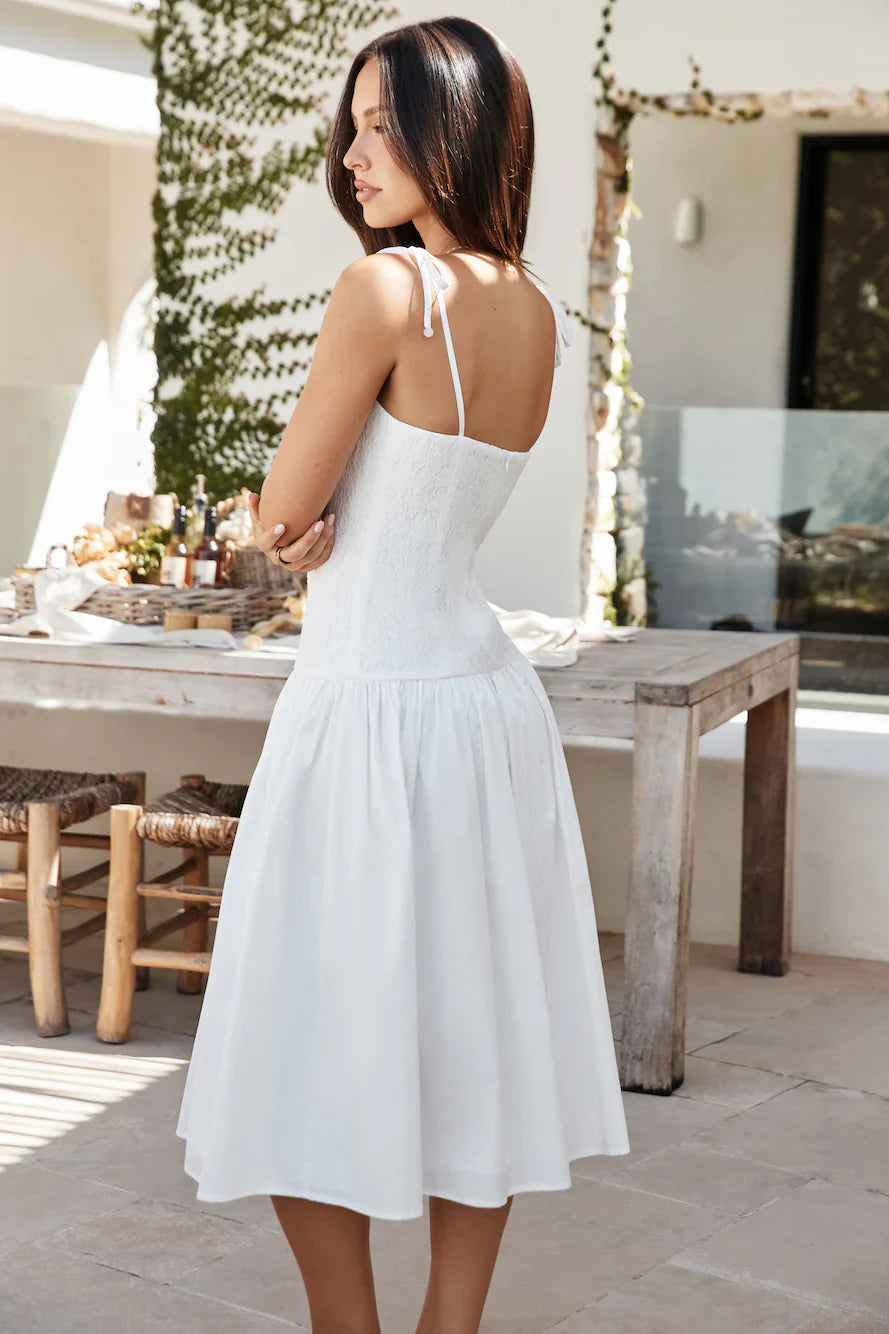 The our Sailing On A Dream Lace Midi Dress White, this dress embodies effortless romance with its delicate lace bodice and airy, flowing skirt. Designed in a crisp white hue, it features dainty tie straps and a fitted silhouette that softly flares for a timelessly feminine look. The intricate lace detailing adds a touch of vintage charm, while the lightweight fabric makes it perfect for sun-drenched days and warm evenings.
