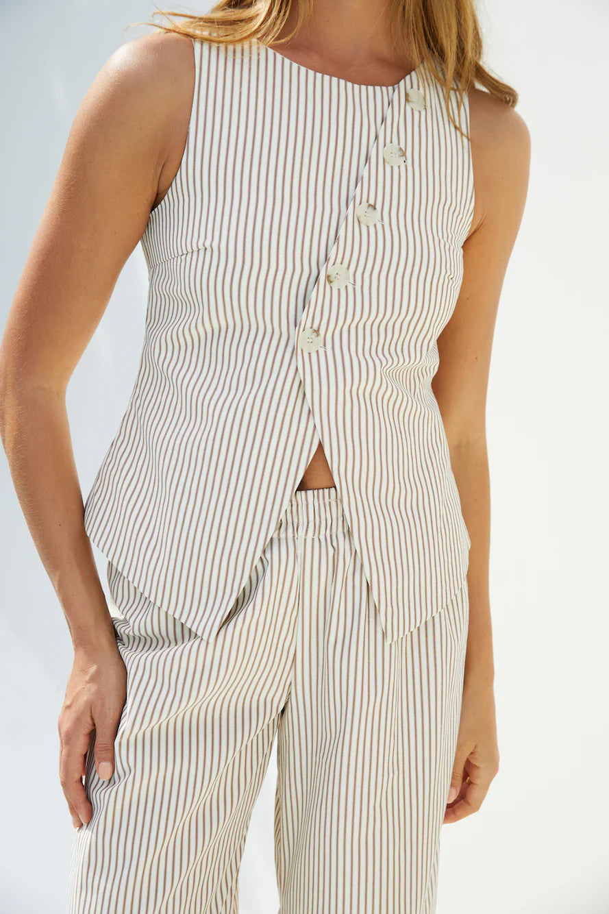 Elevate your summer wardrobe with the Seaside Serenity Top in Brown, a chic and versatile piece perfect for warm-weather adventures. This sleeveless design features a unique off-center button detail and a vertical stripe pattern that flatters your silhouette while adding a stylish touch. Crafted from lightweight fabric, it’s ideal for keeping cool and comfortable on sun-kissed days. Dress it down with denim shorts for a casual vibe, or pair it with tailored trousers for a polished, nautical-inspired look.