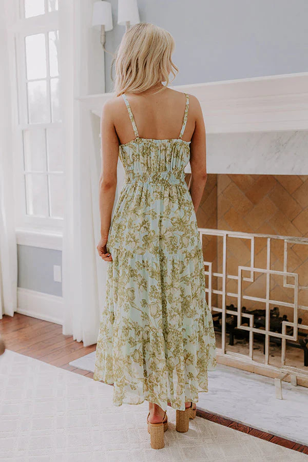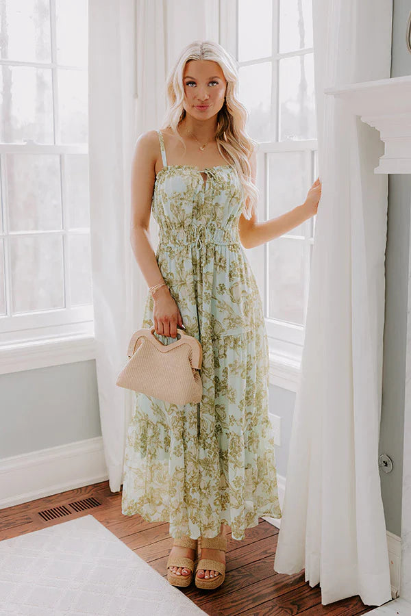 - Sunny days just got a little dreamier! This shimmering striped floral midi dress is all about effortless charm, perfect for soaking up serene moments in style. - Chiffon material with a cream and lime punch colored floral print with gold colored metallic accent stripes - A v- cut neckline with a tie detail and ruffle detailing - Adjustable spaghetti straps - An elastic waistline with a faux drawstring accent bow on the front - A flowy and flattering silhouette that ends in a midi length hemline