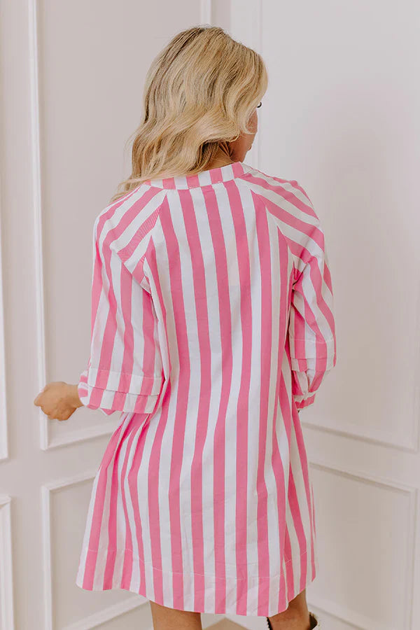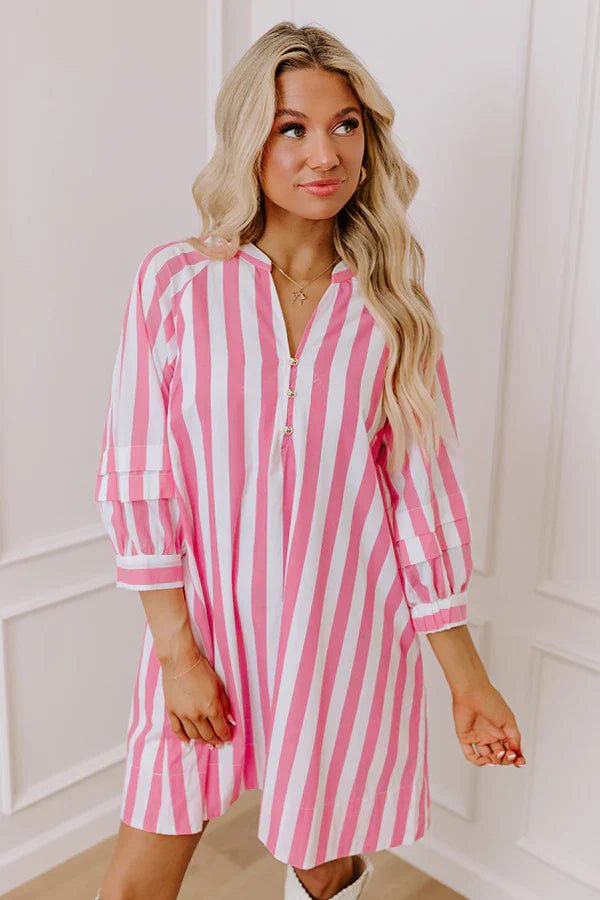 - Keep it chic and sweet with this adorable mini dress! Designed with timeless stripes and tiered sleeve details, it's the perfect pick for an effortlessly stylish vibe. - Lightweight material featuring a white and pink stripe pattern - A built-in lining - A v-cut neckline featuring three buttons for additional coverage - ¾ length sleeves with tiered detail and half elastic cuffs - Hidden side pockets - A relaxed silhouette that ends in a straight hemline